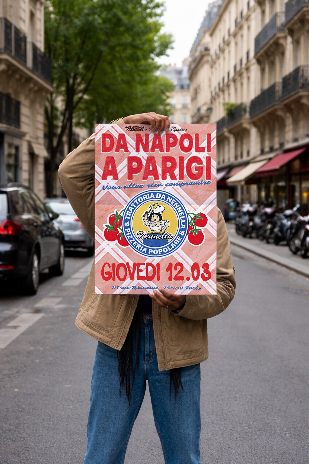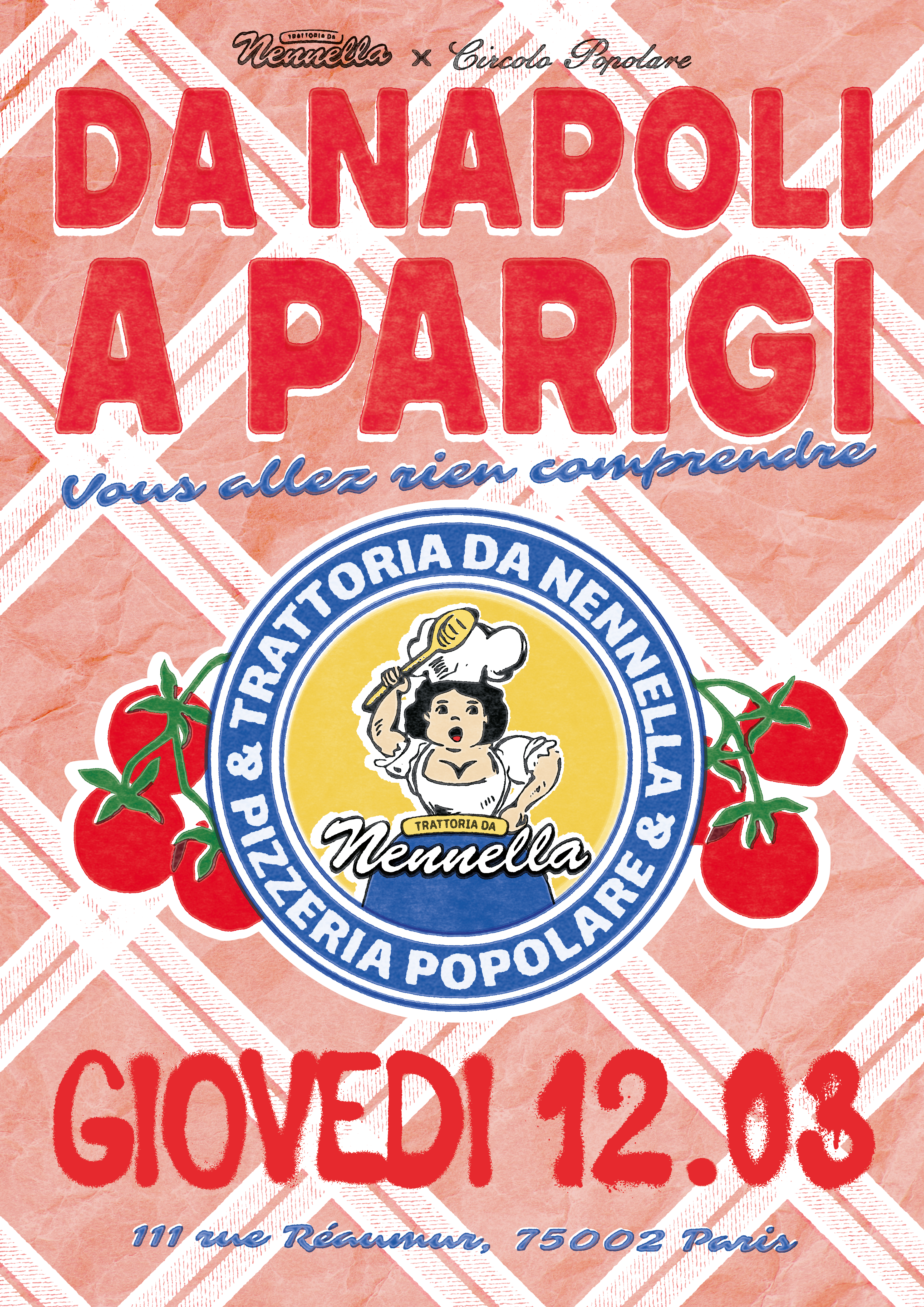 Le visuel s’articule autour de la mascotte de Nennella, placée au centre de l’affiche comme un sceau. J’ai choisi de l’entourer de tomates San Marzano, ingrédient emblématique de la cuisine napolitaine, afin d’introduire une dimension narrative et culinaire, et de renforcer les codes des packagings italiens traditionnels. L’ensemble est soutenu par une palette directement issue de l’univers de la trattoria, et par un travail de texture visant à retrouver un rendu d’impression ancien, légèrement brut.