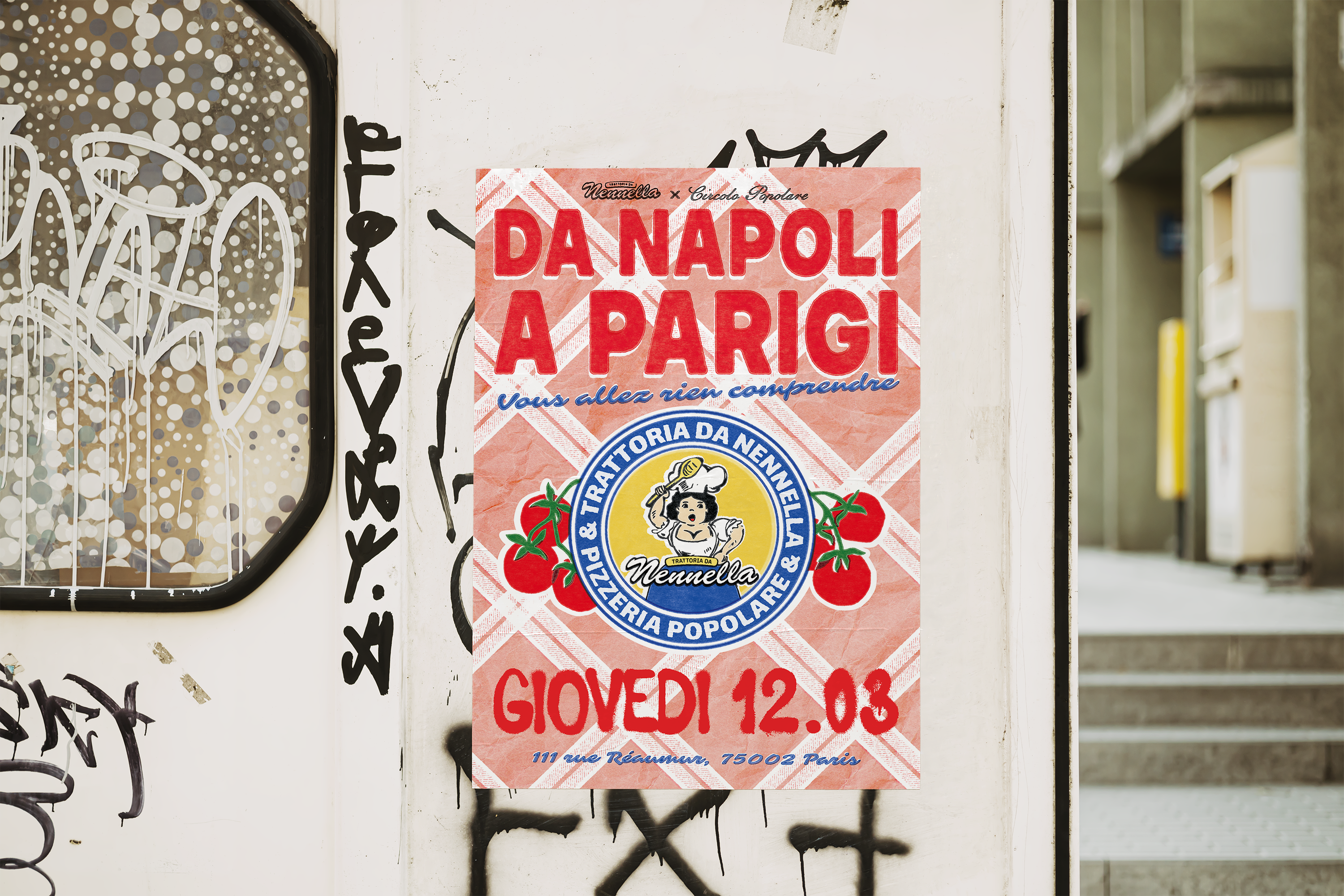 Big Mamma m'a proposé de concevoir une affiche annonçant une collaboration entre Nennella et la Pizzeria Popolare. L’enjeu était de proposer une direction artistique libre, capable de traduire l’énergie napolitaine de Nennella tout en s’inscrivant dans l’univers visuel expressif et populaire de Big Mamma.