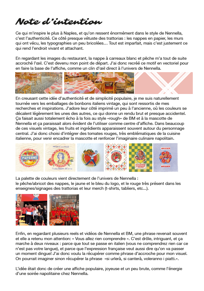 Je me suis appuyée sur les codes visuels des trattorias napolitaines de Nennella, notamment les nappes en papier à carreaux et l’esthétique imparfaite des lieux, pour construire une base graphique authentique. Cette première intention m’a ensuite amenée à explorer l’univers des emballages alimentaires italiens vintage, caractérisés par des aplats de couleurs, des décalages d’impression et des compositions populaires et généreuses.